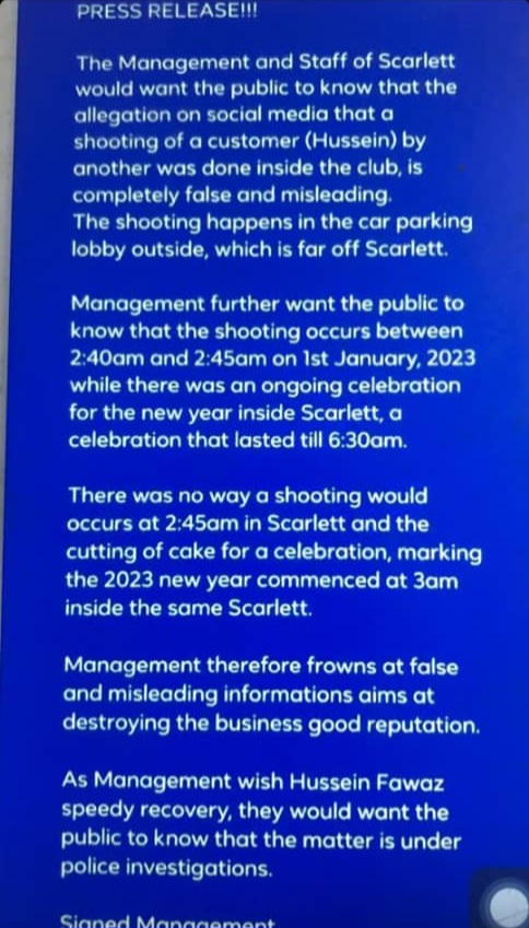 The Management and Staff of Scarlett stated in the press release that the allegation on social media about a shooting of a customer (Hussein) by another was done inside the club, is completely false and misleading. Adding that the shooting happens in the car parking lobby outside, which is far off Scarlett.