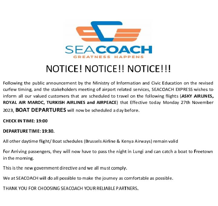 Seacoach Sierra Leone, a prominent sea transportation service, issued a public notice on November 27, 2023, in response to the Ministry of Information and Civic Education’s announcement regarding revised curfew timings and stakeholder meetings related to airport services.