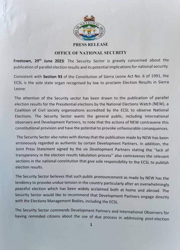The Security Sector in Sierra Leone has expressed grave concerns regarding the recent publication of parallel election results and its potential implications for national security.