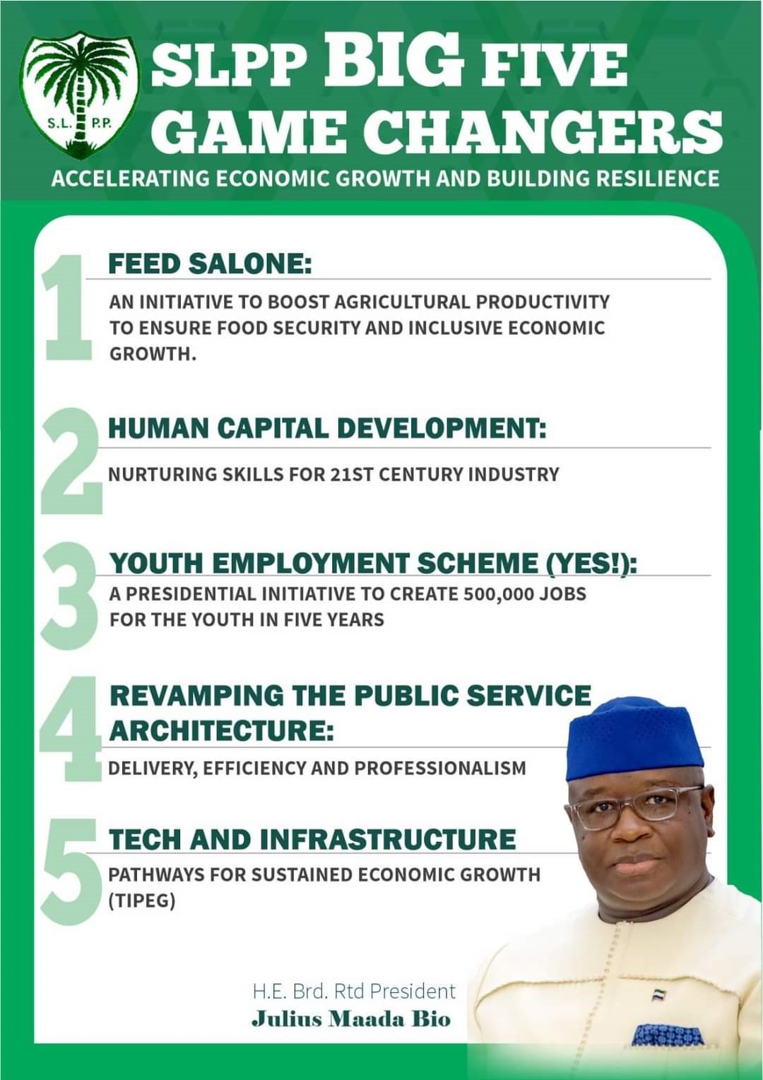 These five changers include: Feed Salone, Human Capital Development, Youth Employment Scheme, Revamping the Public Service Architecture and Tech &Infastructure.