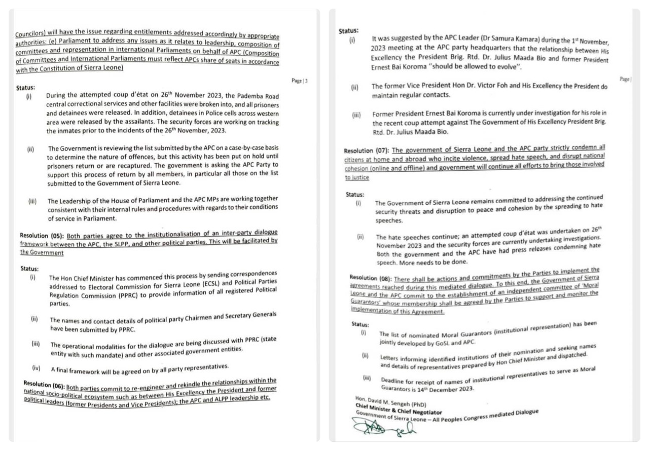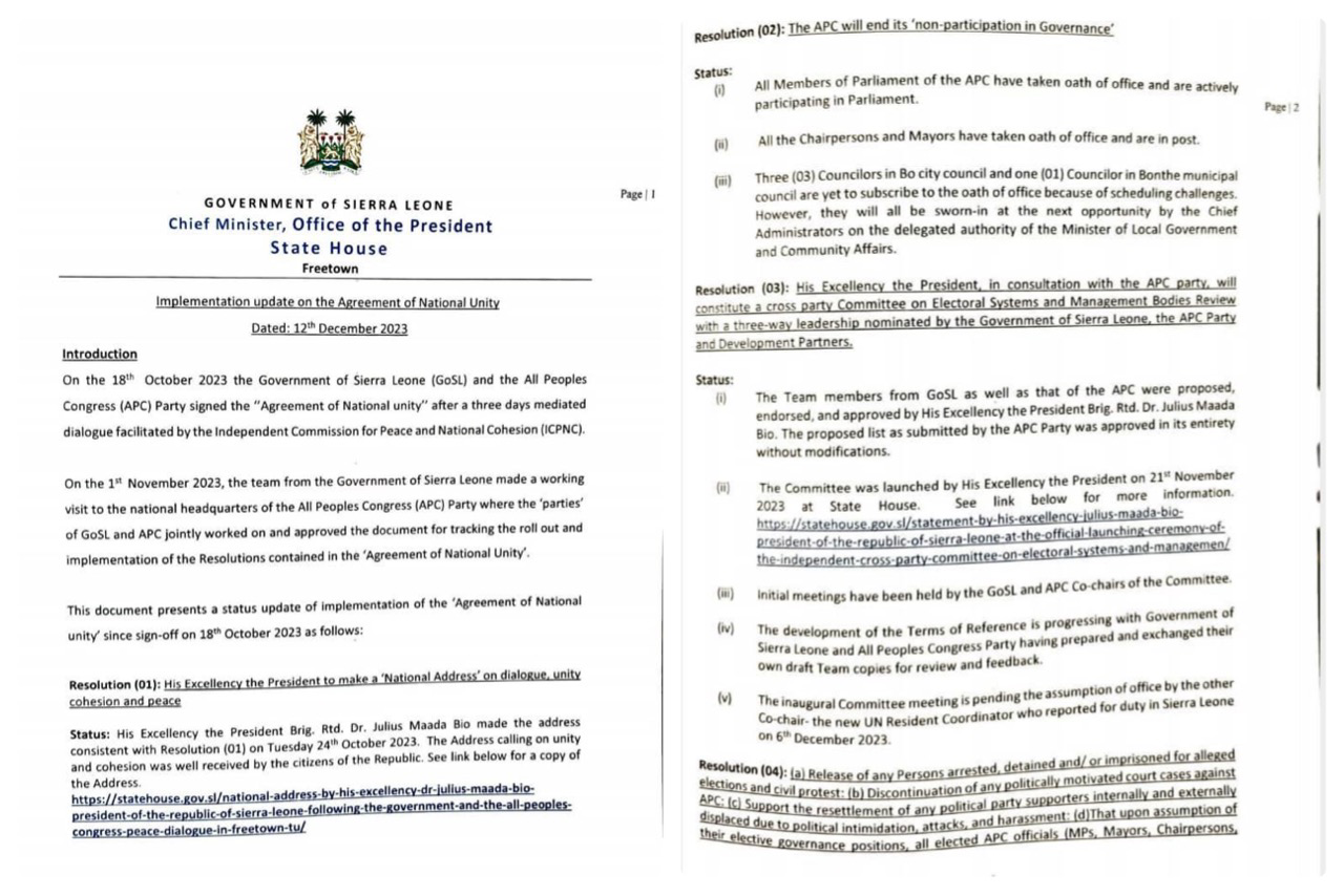 Towards fostering unity and stability, the Government of Sierra Leone (GoSL) and the All Peoples Congress (APC) Party signed the “Agreement of National Unity” on October 18, 2023, following a three-day mediated dialogue facilitated by the Independent Commission for Peace and National Cohesion (ICPNC). Below is an update on the implementation of the Agreement of National Unity by the Government of Sierra Leone Sign by Chief Minister David Moinina Sengeh.