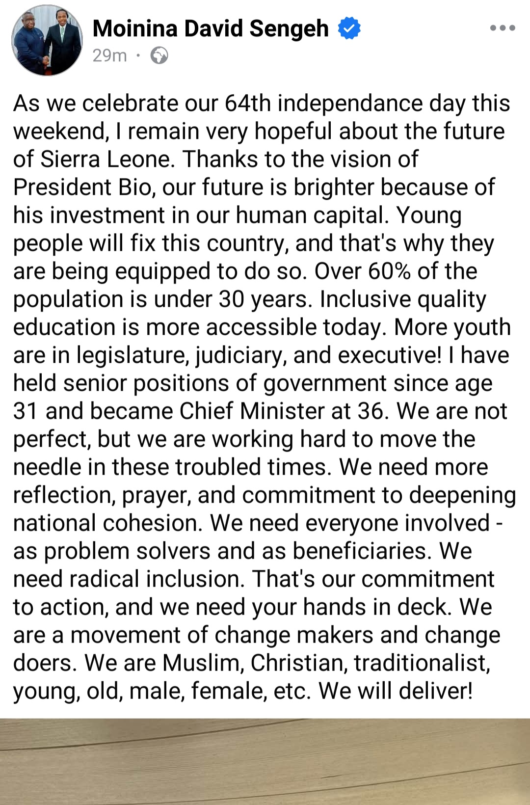 Ahead of Sierra Leone’s 64th Independence Day celebrations this Sunday, Chief Minister Dr. David Moinina Sengeh has shared a message of hope, unity, and progress.