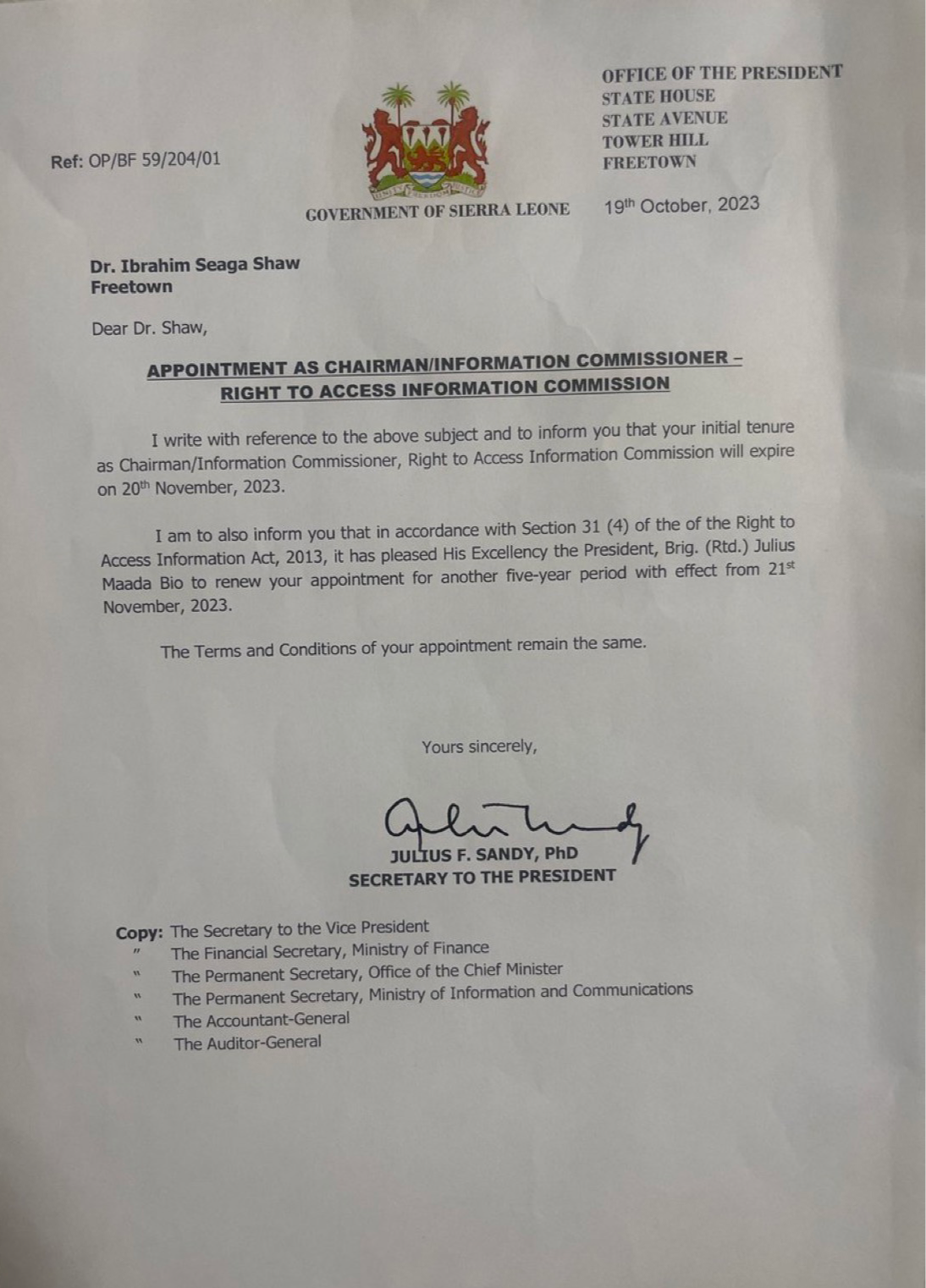 Dr. Shaw conveyed his appreciation, stating, “Today I received my letter of appointment by President Bio as Chairman/Information Commissioner for another five years effective 21st November 2023. I would like to thank the President for the confidence reposed in me and I promise to do more in delivering my mandate.”