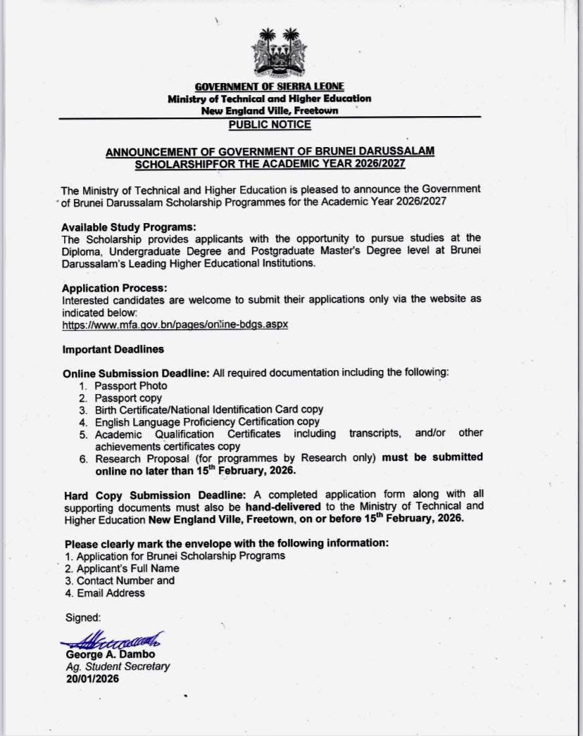 The Government of Sierra Leone, through the Ministry of Technical and Higher Education, has announced the availability of scholarship opportunities offered by the Government of Brunei Darussalam in Southeast Asia, for the 2026/2027 academic year.