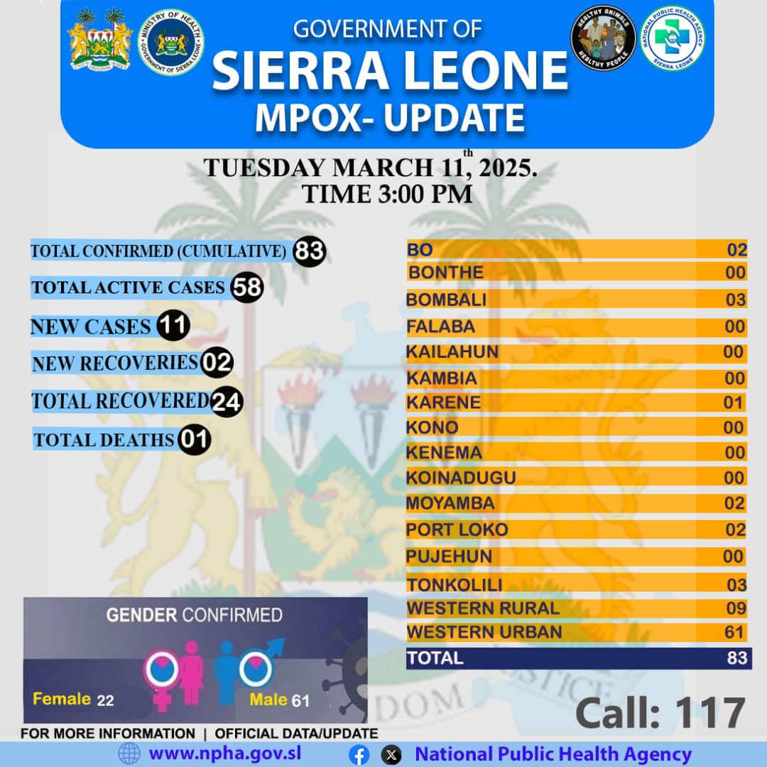 The Sierra Leone Ministry of Health has released an update on the Mpox situation in the country, reporting 11 new confirmed cases as of Tuesday, March 11, 2025, at 3:00 PM. This brings the total number of active cases to 58.