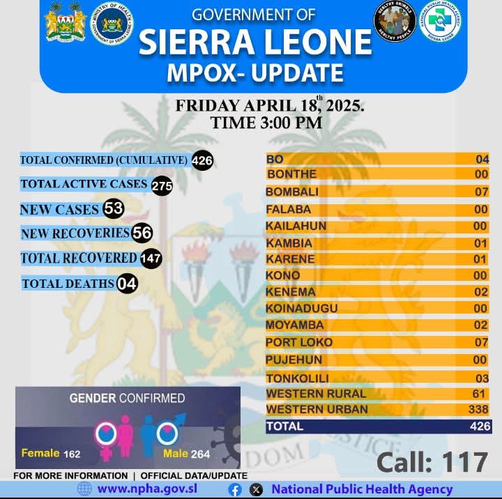 Health authorities in Sierra Leone have reported a significant increase in MPox cases, according to the latest update released Friday, April 18, 2025, at 3:00 PM local time.