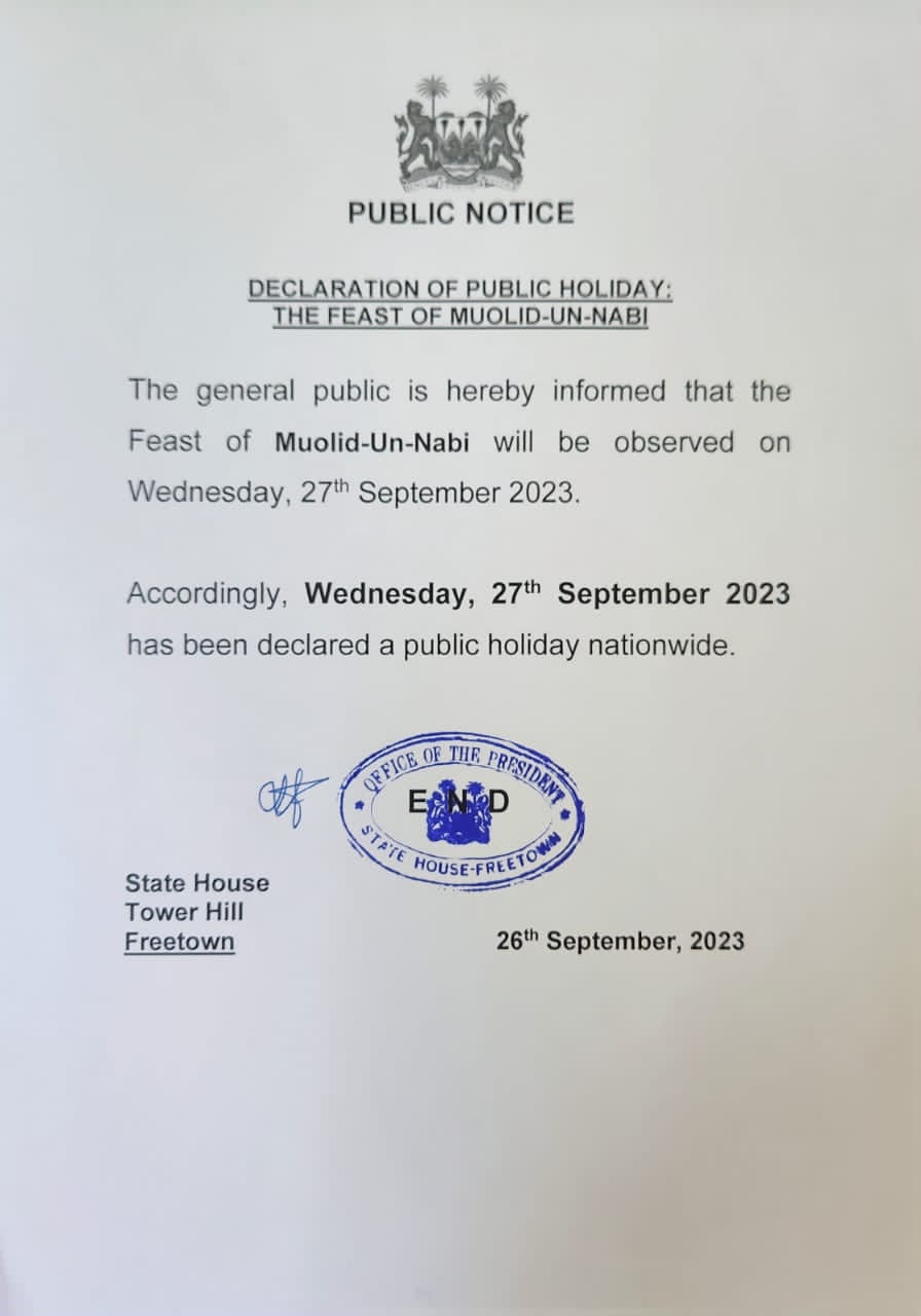 The Government of Sierra Leone has announced Wednesday, September 27, 2023, as a public holiday in observance of the Feast of Muolid un-Nabi.