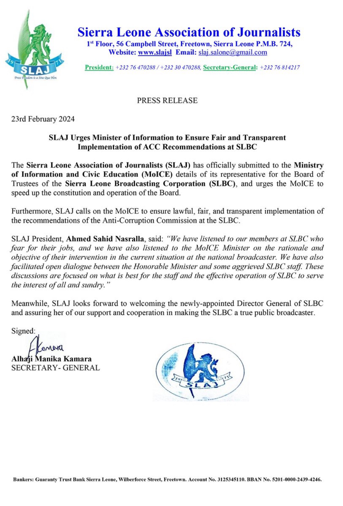 The Sierra Leone Association of Journalists (SLAJ) has taken a decisive step towards ensuring transparency and accountability at the Sierra Leone Broadcasting Corporation (SLBC).