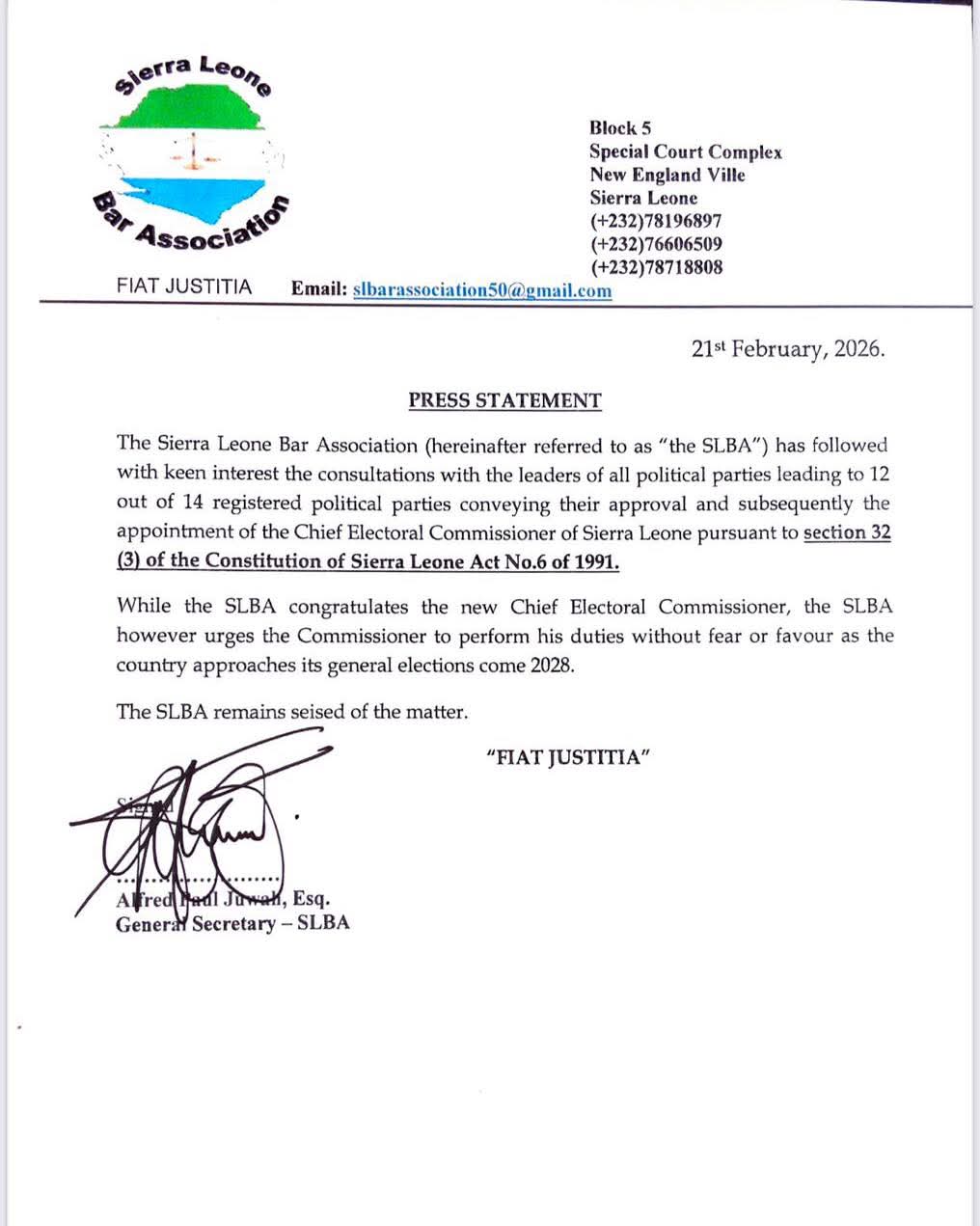 The Sierra Leone Bar Association (SLBA) has officially responded to the recent appointment of the nation’s new Chief Electoral Commissioner, Edmond Alpha, calling for strict impartiality as the country begins its long-term preparations for the 2028 general elections.