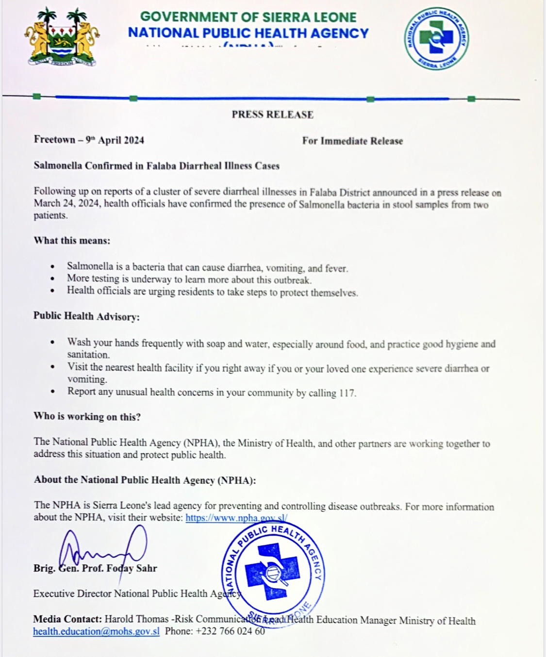 Sierra Leone’s National Public Health Agency (NPHA) has confirmed cases of Salmonella Diarrhoeal illness in Falaba District, according to a press release issued by the agency.