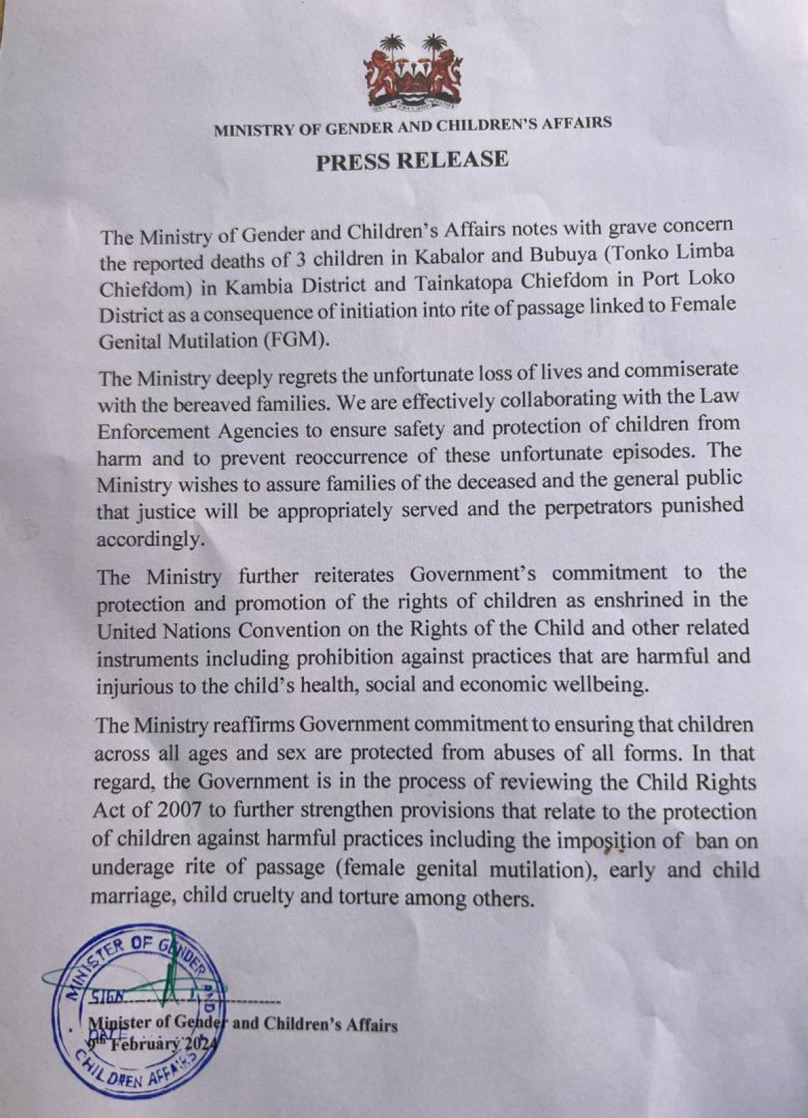 The Ministry of Gender and Children’s Affairs has issued a stern press release following the tragic deaths of three children in Kabalor and Bubuya (Tonko Limba Chiefdom) in Kambia District, and Tainkatopa Chiefdom in Port Loko District, reportedly as a result of initiation into a rite of passage associated with Female Genital Mutilation (FGM).
