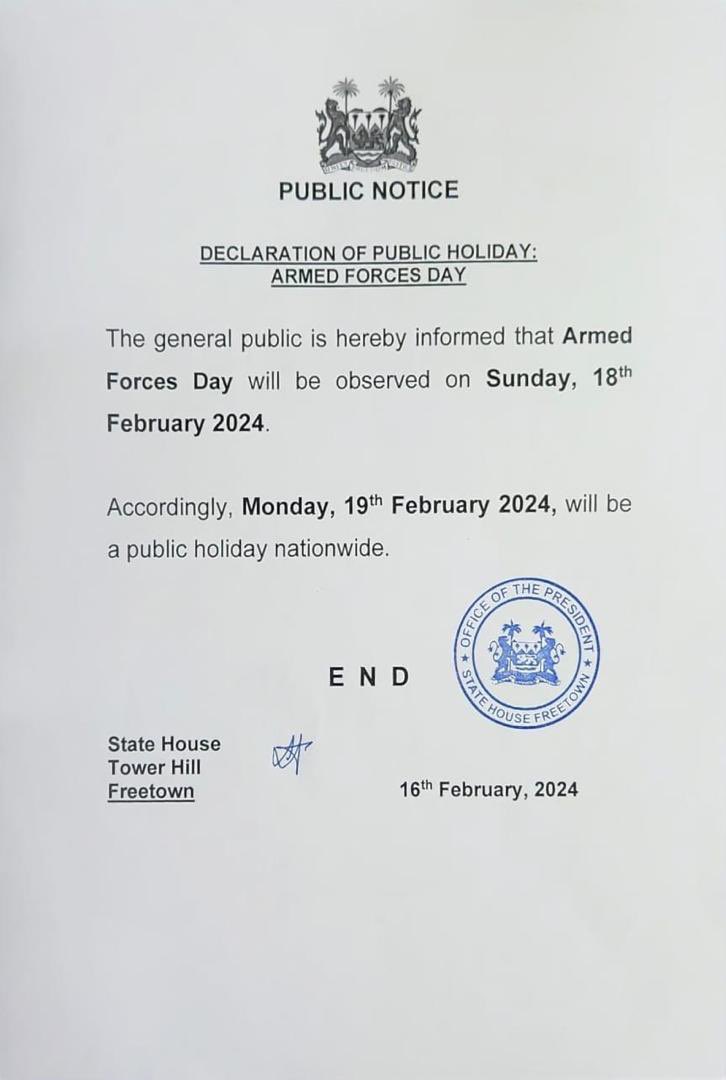 The Government of Sierra Leone has declared Monday, February 19 as a national public holiday to mark the 2024 Armed Forces Day.