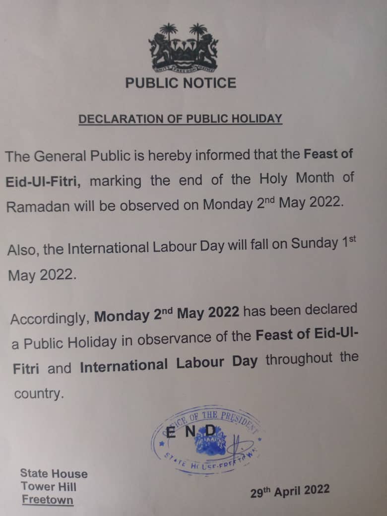 The government of Sierra Leone has declared Monday, May 2, 2022 as work-free day to mark this year’s International Labour Day and Eid-el-Fitr celebrations.