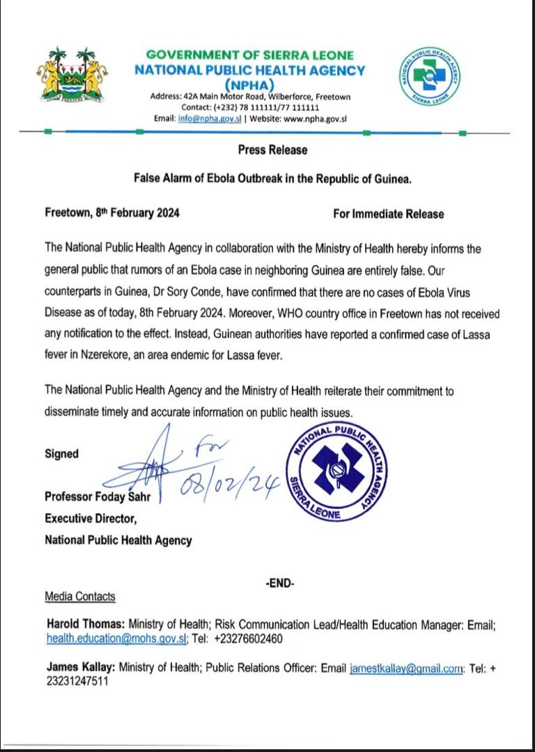 The Sierra Leone National Public Health Agency, in collaboration with the Ministry of Health, has issued a statement debunking circulating rumors regarding an Ebola outbreak in neighboring Guinea.