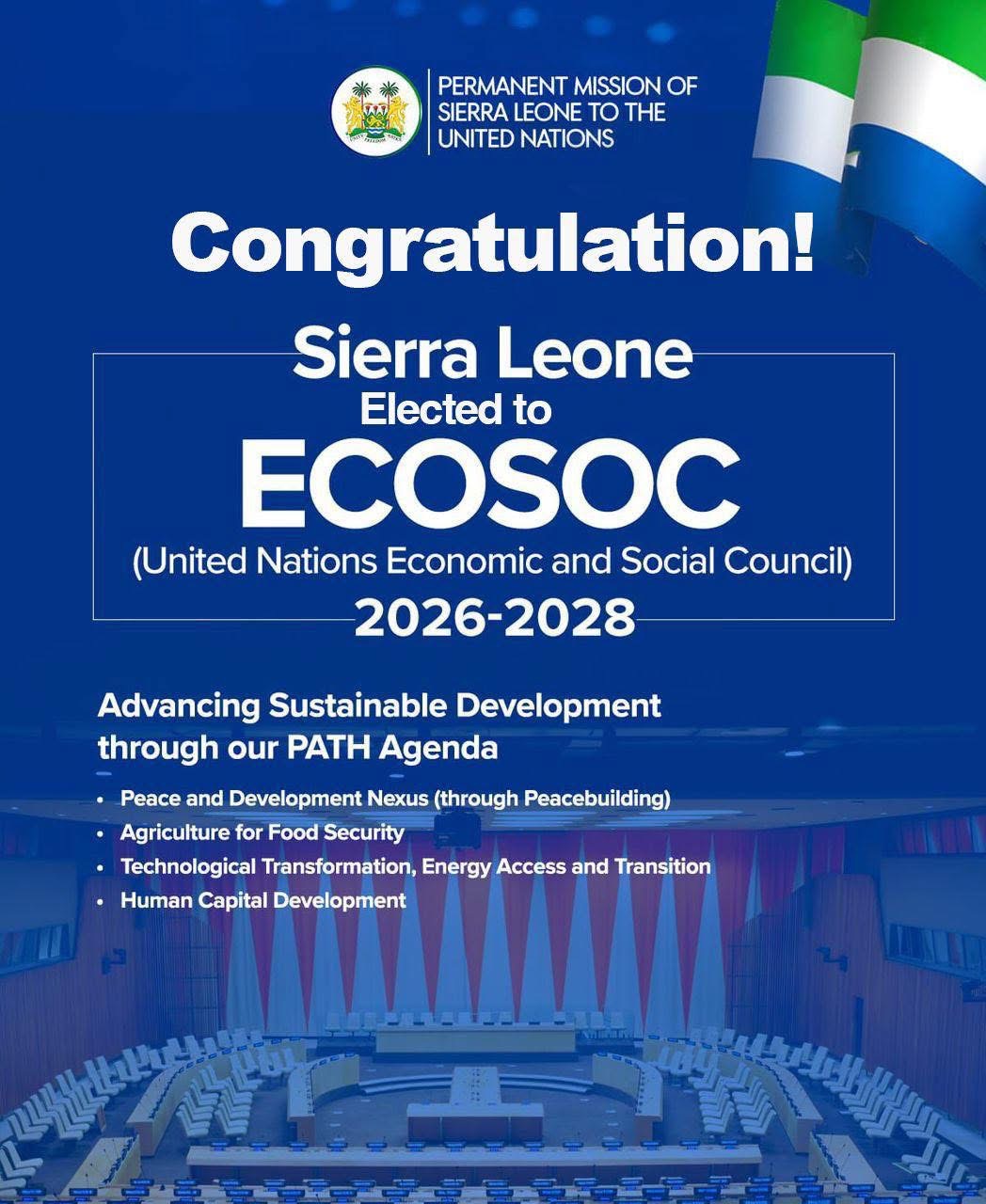 President Dr. Julius Maada Bio announced that Sierra Leone has been elected to the United Nations Economic and Social Council (ECOSOC) for the 2026-2028 term, receiving 186 votes.