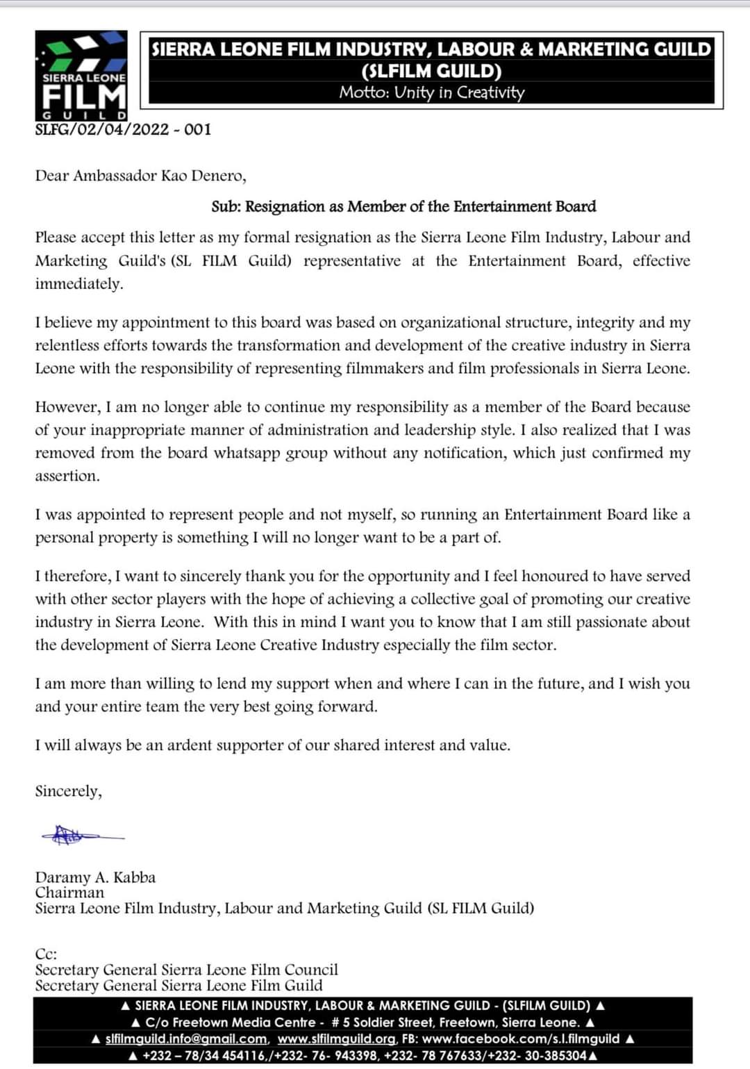The Chairman of the Sierra Leone Film Industry, Labour and Marketing Guild (SL Film Guild), Daramy A Kabba has on Saturday 2 April tendered an official resignation letter as member of the Entertainment Board.