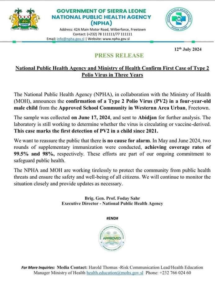 The National Public Health Agency (NPHA), in collaboration with the Ministry of Health (MOH), has confirmed the first case of Type 2 Polio Virus (PV2) in three years. The case involves a four-year-old male child from the Approved School Community in Western Area Urban, Freetown.