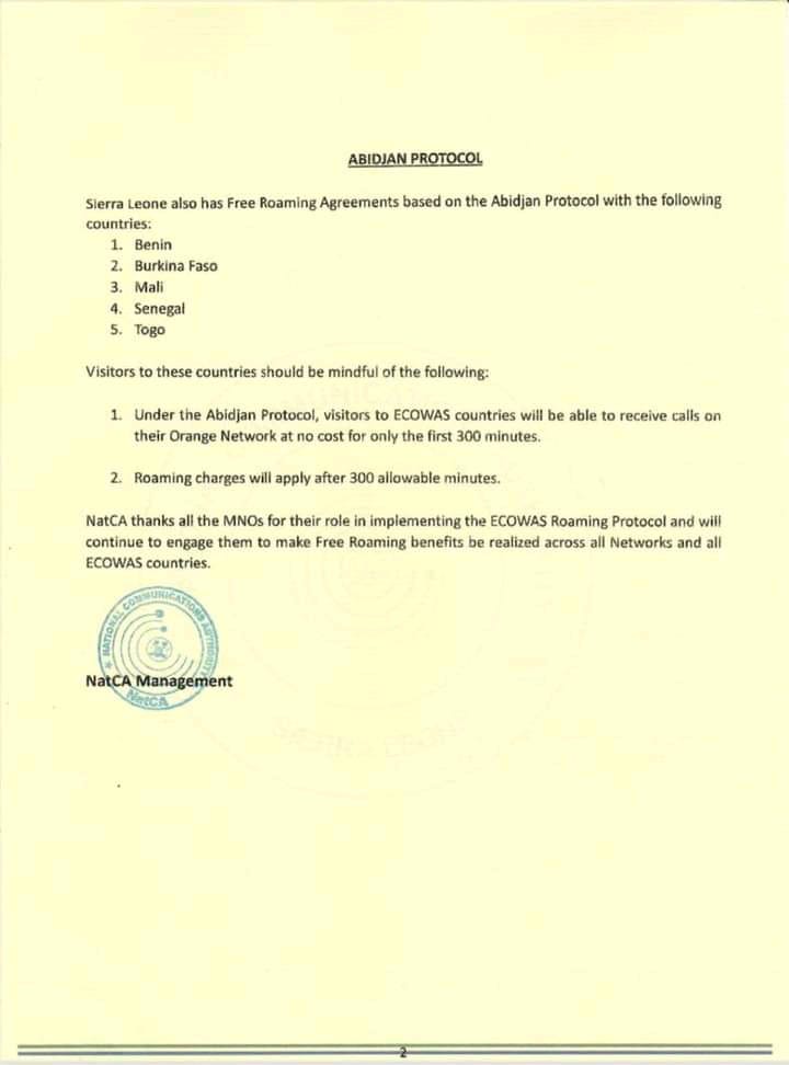 The Abidjan Protocol covers roaming agreements between Sierra Leone and five ECOWAS member states: