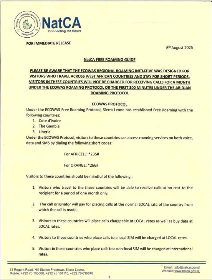 Sierra Leone’s National Communications Authority (NatCA) has formally announced the implementation of regional free roaming arrangements under the ECOWAS Roaming Protocol and the Abidjan Protocol.