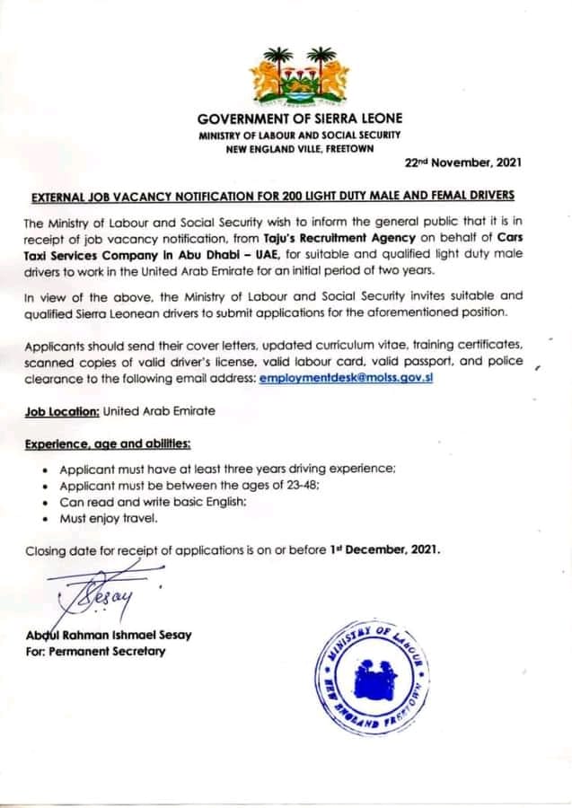 The Ministry of Labour and Social Security has announced jab vacancies for 200 Sierra Leonean drivers to work in Abu Dhabi, United Arab Emirates.