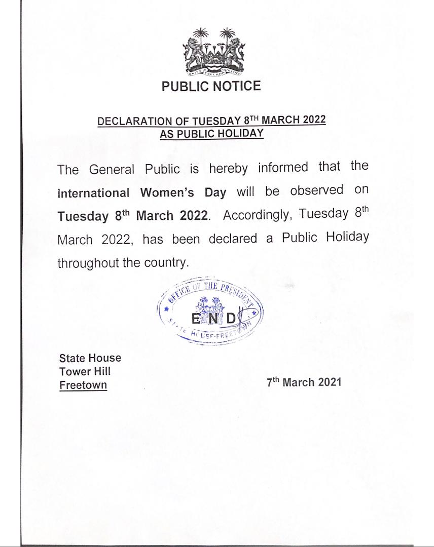 Accordingly, Tuesday 8th March 2022, has been declared a public holiday throughout the country.