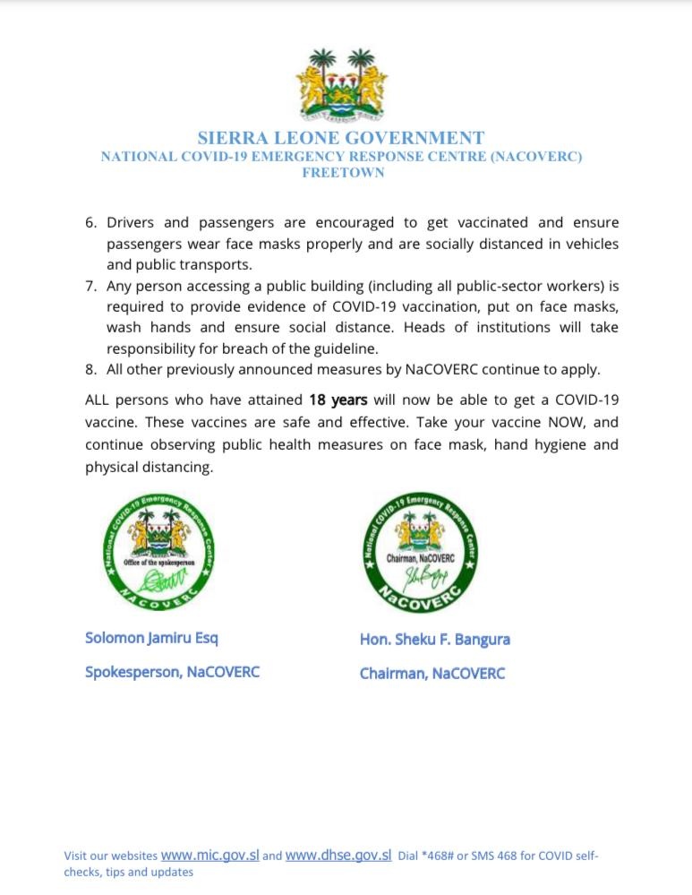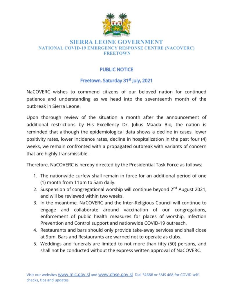 The government of Sierra Leone through the National COVID-19 Emergency Response Centre (NaCOVERC) has announced extension of the measures taken to curtail the spread of the third wave of COVID-19 in the country.