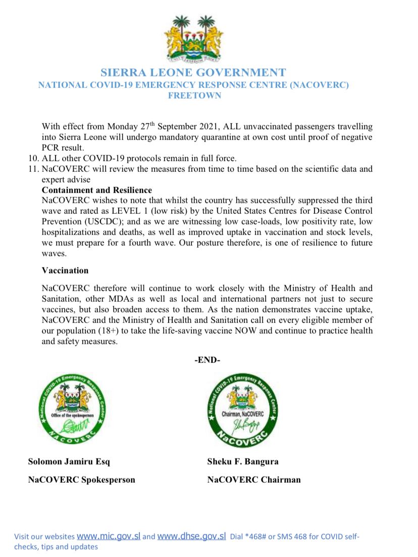 Sierra Leone reimposed curfew and tighten its COVID-19 restrictions from Monday 5th July, 2021. The nationwide daily curfew was from 11:00 p.m. to 05:00 and gastronomical venues were asked to close at 09:00 p.m.