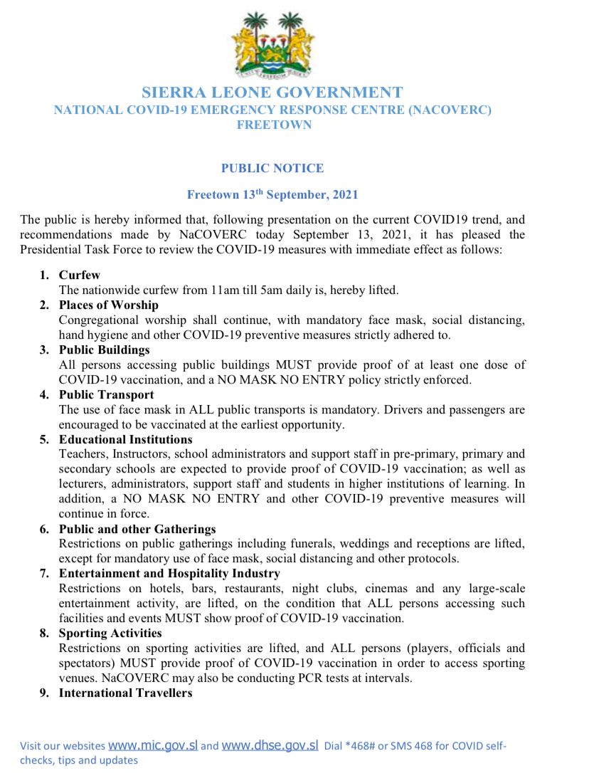 The Government of Sierra Leone has lifted the nationwide curfew that was imposed to curb the third wave of coronavirus.