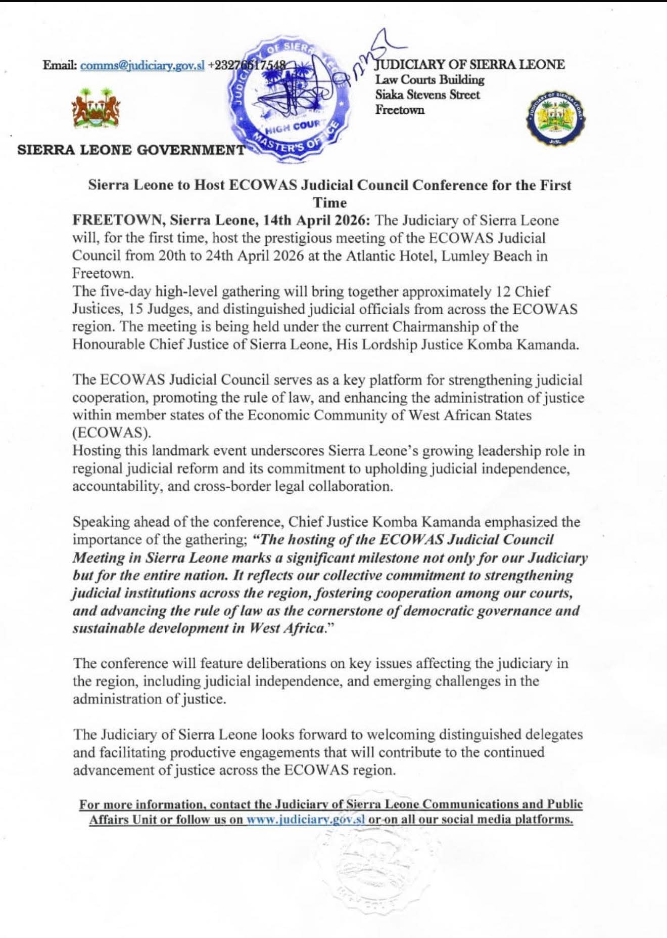 The Judiciary of Sierra Leone is set to host the first meeting of the ECOWAS Judicial Council from April 20 to 24, 2026, at the Atlantic Hotel in Freetown.
