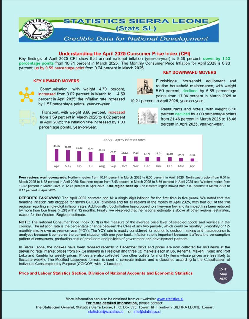 Sierra Leone has recorded a significant economic milestone as its annual national inflation rate (year-on-year) for April 2025 declined to 9.38 percent.