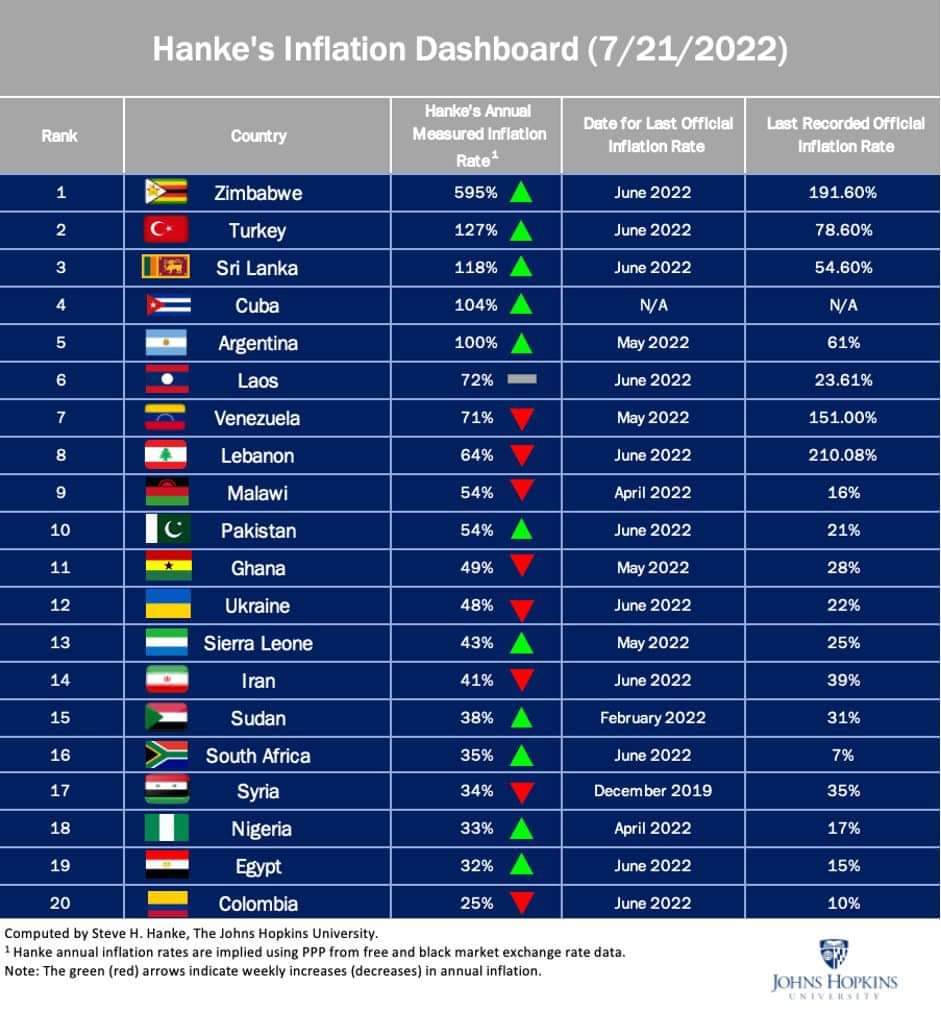 A renowned international economist at the Johns Hopkins University in the United States, Professor Steve Hanke has ranked Sierra Leone 13th place on his inflation dashboard published on Thursday 21 July 2022.