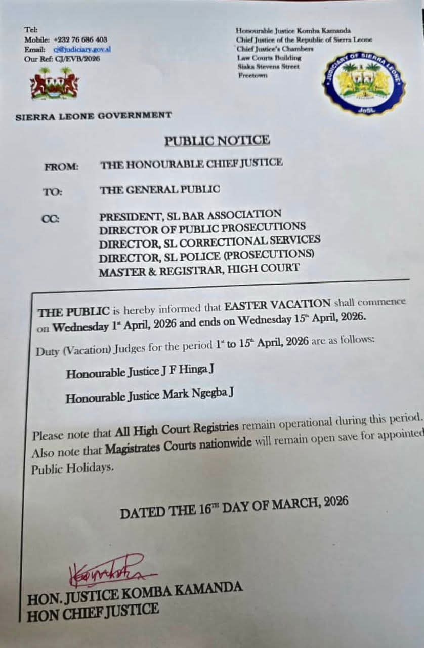 The Chief Justice of the Republic of Sierra Leone, Hon. Justice Komba Kamanda, has officially announced the dates for the judiciary’s 2026 Easter Vacation.
