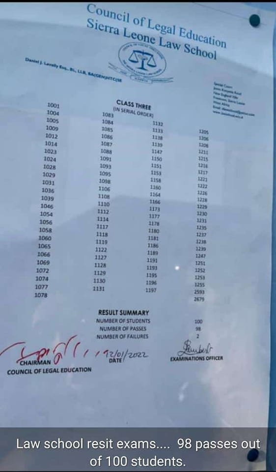 Sierra Leone Law School has published the results for the 2021 Bar Examination for students that wish to become legal practitioners.