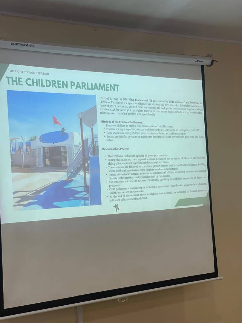 The Moroccan delegation featured Hamza Chbihi, Counsellor at the Embassy of Morocco; Professor Ghizlane Banjellovn, Vice President of ONDE and a child psychiatry expert; and Mrs. Soukaina Kacir, executive responsible for the Children’s Parliament in Morocco.