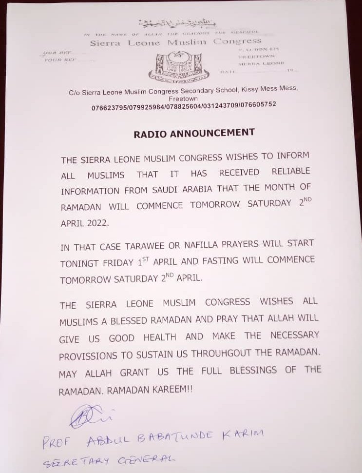 The Sierra Leone Muslim Congress wishes to inform all Muslims that it has received reliable information from Saudi Arabia that the month of Ramadan will commence from tomorrow Saturday 2nd April 2022.