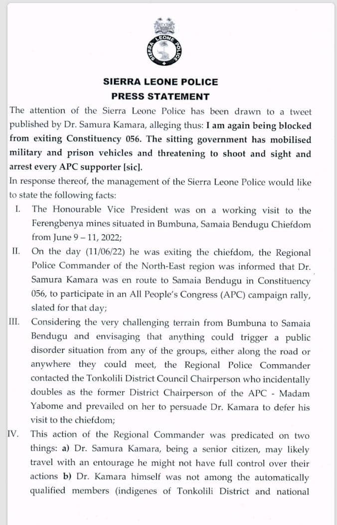 The attention of the Sierra Leone Police has been drawn to a tweet published by Dr. Samura Kamara, alleging thus: I am again being blocked from exiting Constituency 056. The sitting government has mobilized military and prison vehicles and threatened to shoot and sight and arrest every APC supporter [sic]. In response thereof, the management of the Sierra Leone Police would like