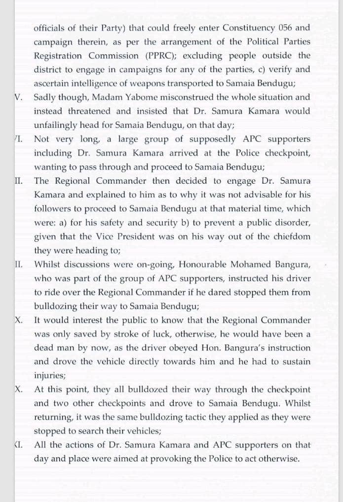 This action of the Regional Commander was predicated on two things: a) Dr. Samura Kamara, being a senior citizen, may likely travel with an entourage he might not have full control over their actions b) Dr. Kamara himself was not among the automatically qualified members (indigenes of Tonkolili District and national officials of their Party) that could freely enter Constituency 056 and campaign therein, as per the arrangement of the Political Parties Registration Commission (PPRC); excluding people outside the district to engage in campaigns for any of the parties, c) verify and ascertain intelligence of weapons transported to Samaia Bendugu;