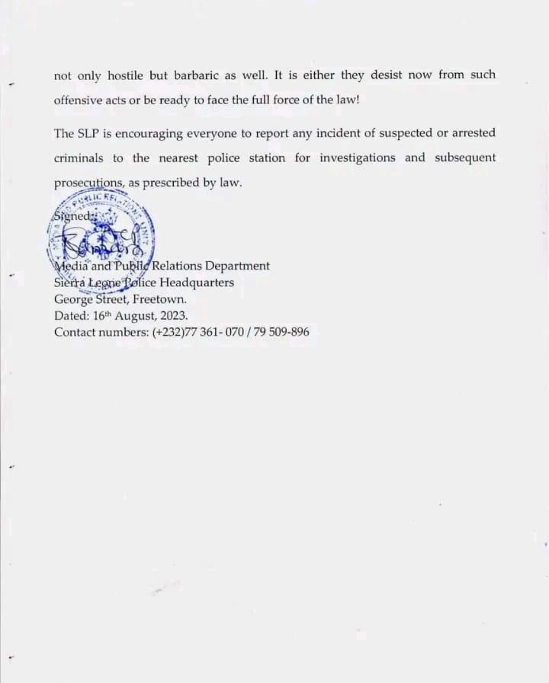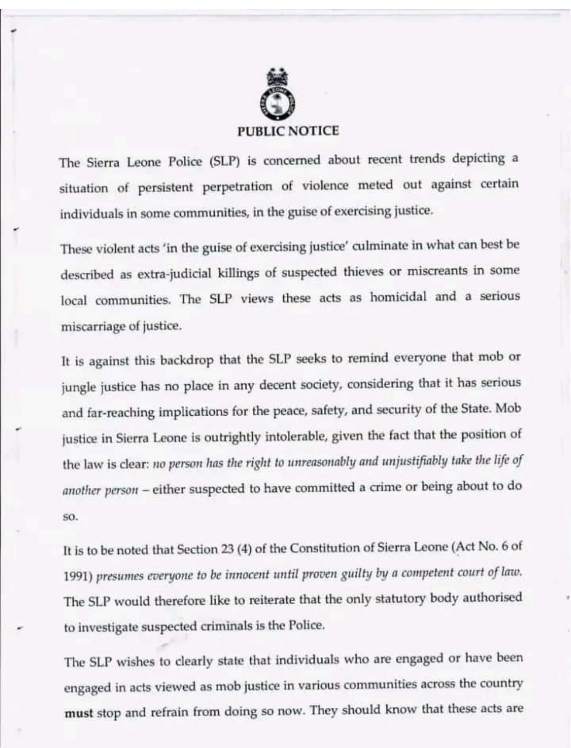 The Sierra Leone Police (SLP) in a press release warns the general public of extra-judicial killings of suspected thieves and criminals across the country.