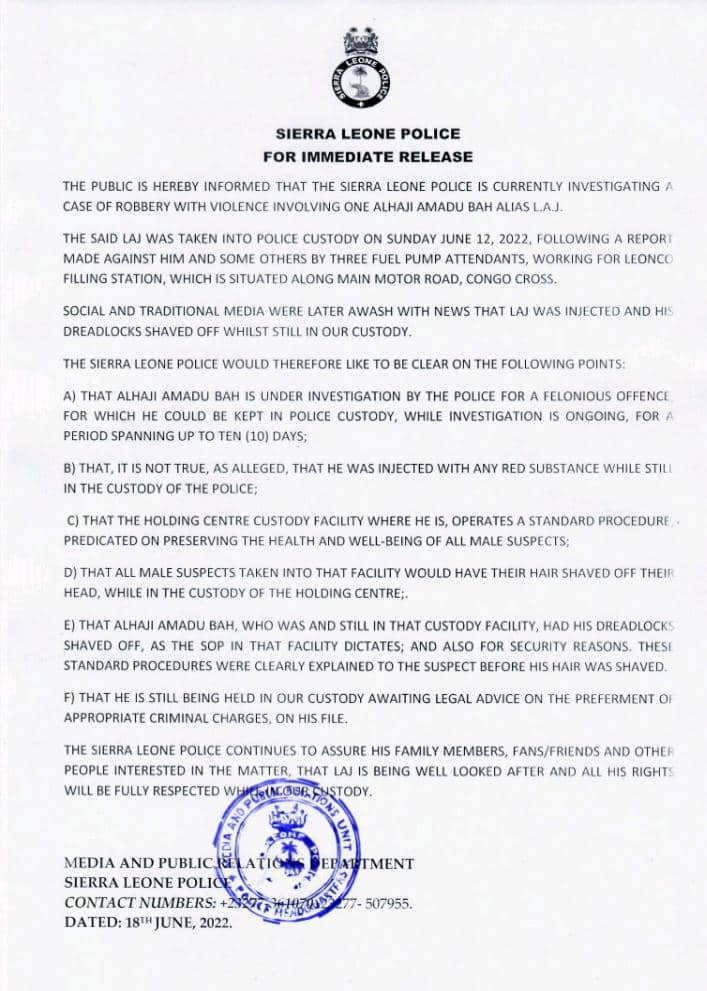 Police in Sierra Leone has released a statement on the arrest of Alhaji Amadau Bah alias L.A.J or Boss La.