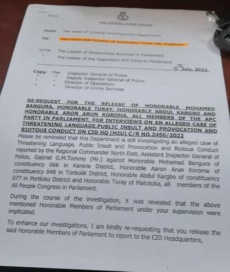 The Sierra Leone Police (SLP) has written to the Parliament of Sierra Leone requesting for the release of four Members of Parliament of the main opposition All Peoples Congress (APC) for interviews at the Criminal Investigation Department (CID).