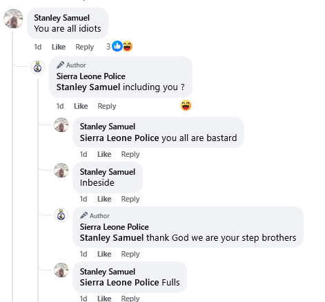 The situation escalated when Stanley Samuel, replied, “Sierra Leone Police you all are bastard.” The police account again responded directly, writing, “Stanley Samuel thank God we are your step brothers.”