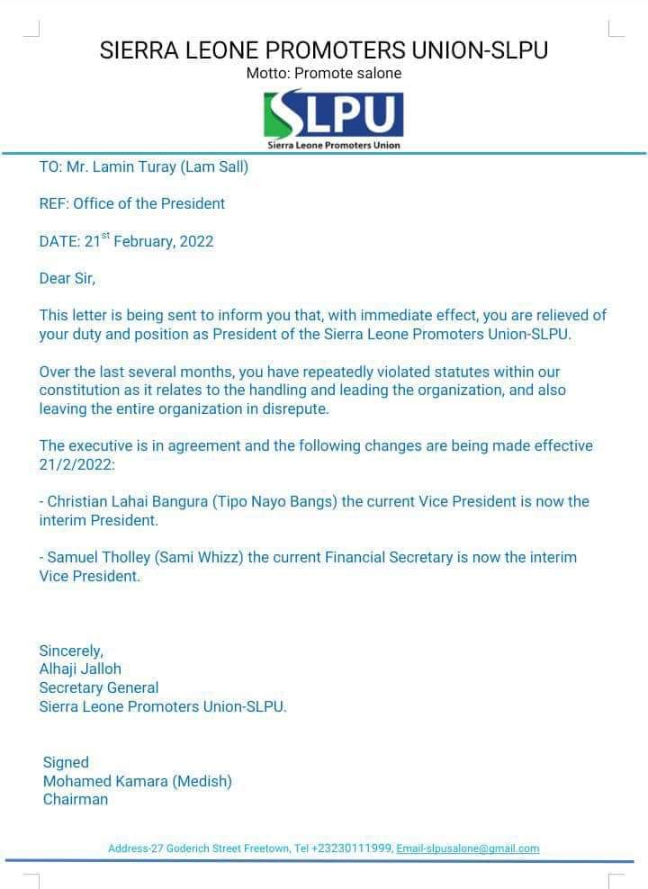 Sierra Leone Promoters Union (SLPU) has relieved Lamin Turay commonly known as Lam Sall from his duty and position as President for SLPU.