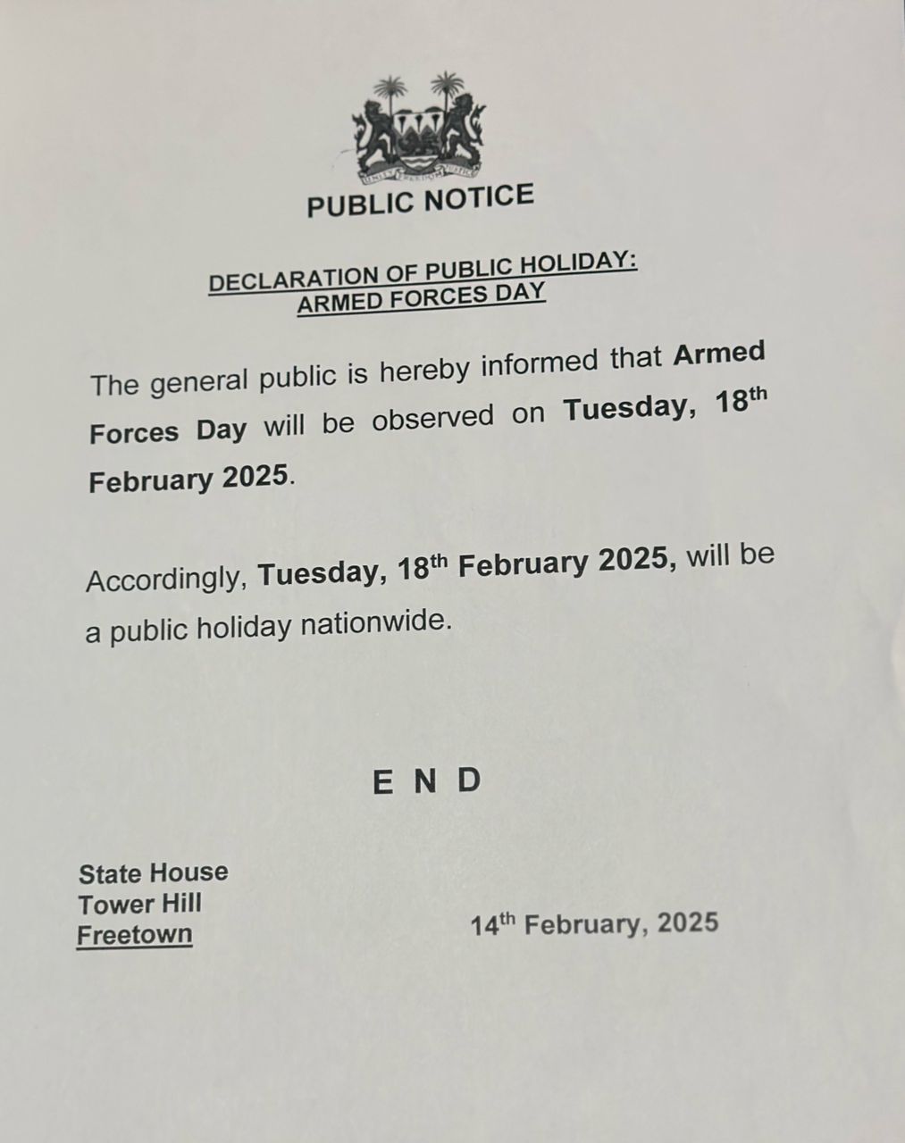 The Government of Sierra Leone has declared Tuesday, February 18 as a national public holiday to mark the 2025 Armed Forces Day.