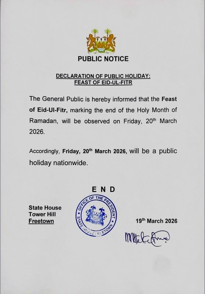 The Government of Sierra Leone has in a public notice announced that the feast of Eid Al Fitr, which signifies the end of the Holy Month of Ramadan, will take place on Friday, March 20, 2026.