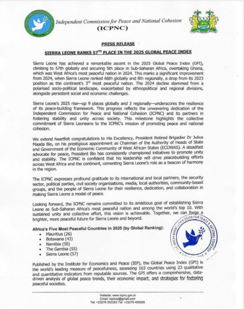 Sierra Leone has climbed to 57th place globally in the 2025 Global Peace Index and is now ranked 5th in Africa, and 2nd in West Africa.