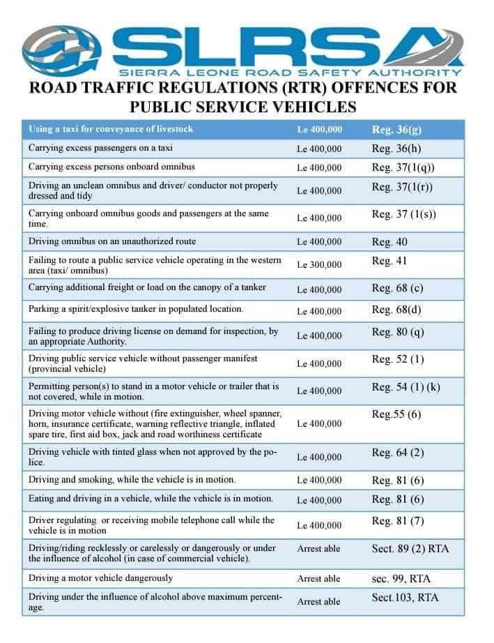 Sierra Leone Road safety Authority (SLRSA) has announced a list of road traffic regulations and offences for public service vehicles.