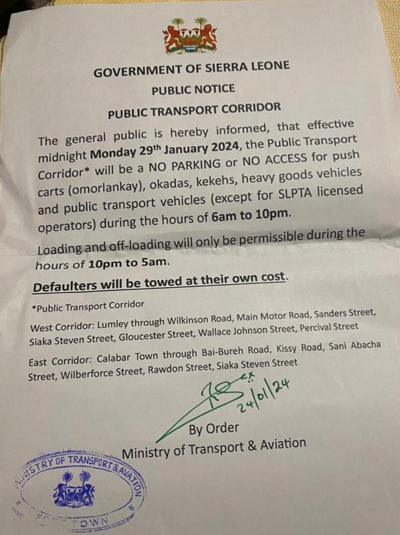 According to the public notice, the affected time period is from 6 am to 10 pm, during which the public corridors will be off-limits for pushcarts (Omorlankay), Okadas, Kekeh, heavy goods vehicles, and public transport vehicles. The restriction, however, does not apply to operators with licenses from the Sierra Leone Public Transport Authority (SLPTA) during the specified hours.