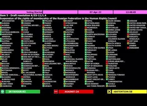 A two-thirds majority of voting members in the 193-member General Assembly in New York – abstentions do not count – was needed to suspend Russia from the 47-member Geneva-based Human Rights Council.