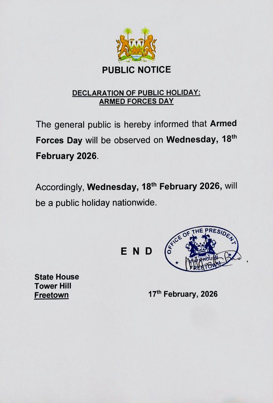 The Government of Sierra Leone has officially declared Wednesday, February 18, 2026, a nationwide public holiday in observance of Armed Forces Day.