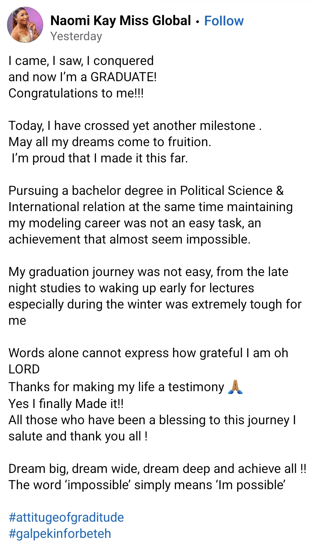Sierra Leonean professional international model, winner of Face of Africa, and Miss Global International among many, Naomi Kay has displayed her ecstatic emotions as she bagged a bachelor’s Degree in Political Science and International relation in Turkey.